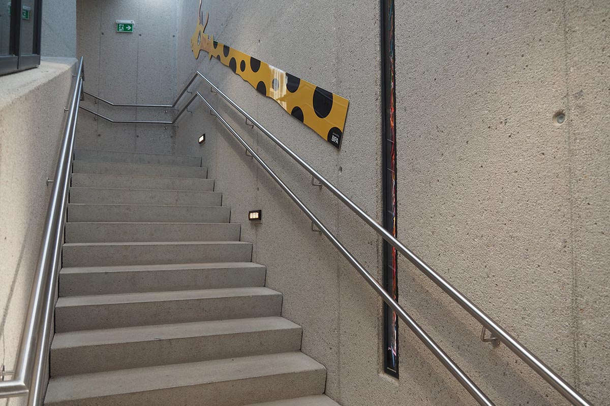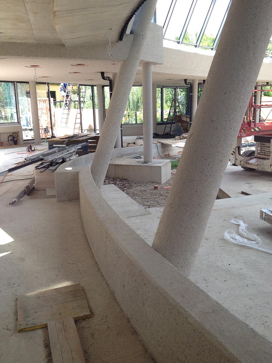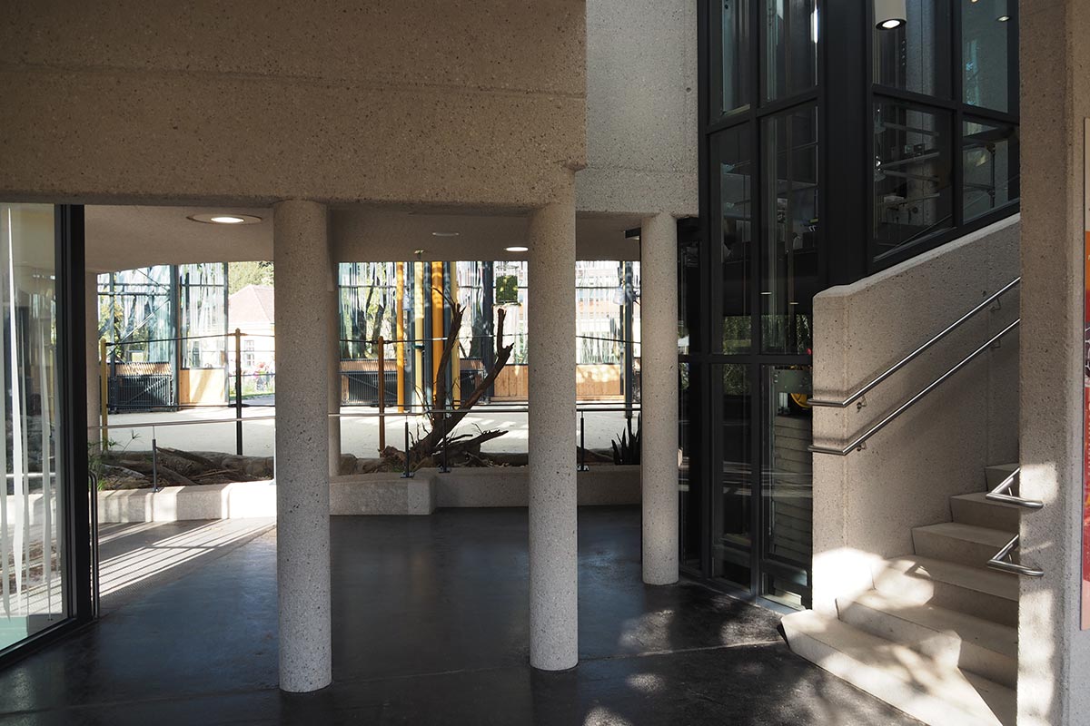 - Bauteile aus Beton - mit in Handarbeit gestockten Sicht-Oberflächen und Farbbeton-Bodenflächen im Giraffenmuster um einen besonderen Bezug zum natürlichen Lebensraum der Tiere herzustellen und die Individualität der Handarbeit zu verwerten.