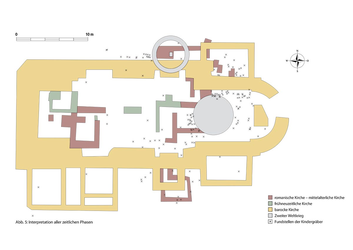 Die Grundidee des Entwurfs ist eine systematische Gliederung und Darstellung der unterschiedlichen historischen Funde nach ihrem zeitlichen Ursprung. Ein weiteres Ziel ist, die besondere Atmosphäre und Schönheit des Ortes nicht zu beeinträchtigen und deshalb möglichst sensibel und zurückhaltend zu agieren. Die Grundrisse der Barockkirche, der Vorgängerkirchen aus der frühen Neuzeit und dem Mittelalter sowie der Bauten aus der Zeit des Zweiten Weltkrieges werden in ihrer tatsächlichen Dimension durch eingefärbte Betonflächen sichtbar und erfahrbar gemacht. Es entsteht so ein begehbarer 1:1-Plan, der die Fundamente bzw. Mauern aufgreift und anhand seiner farblichen Differenzierung die Erkenntnisse der Archäologie und Bauforschung vermittelt. Das Kunstwerk orientiert sich an den tatsächlichen Funden.