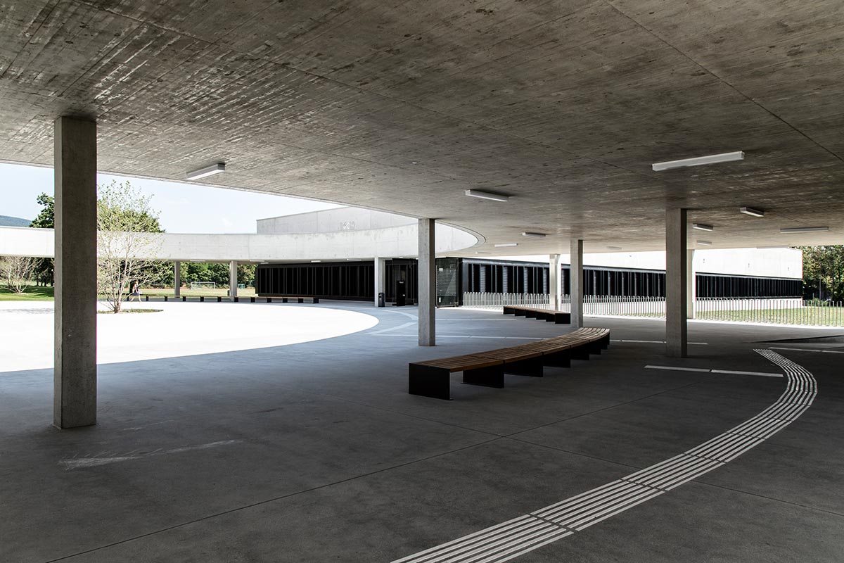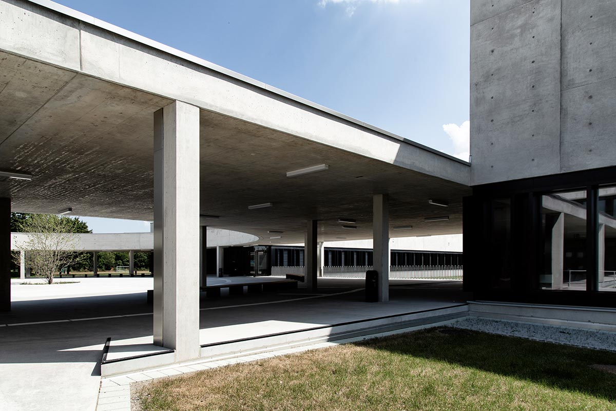 Die gesamte Schulanlage ist als Stahlbetonskelett mit den minimalst erforderlichen statischen Bauteilen reduziert.